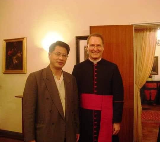 IAE國際學士院大學校長陳俊吉教授院士共融追求「全球和平」 出席慶祝教宗本篤十六世就任四週年紀念酒會與梵蒂岡陸思道蒙席代辦合影